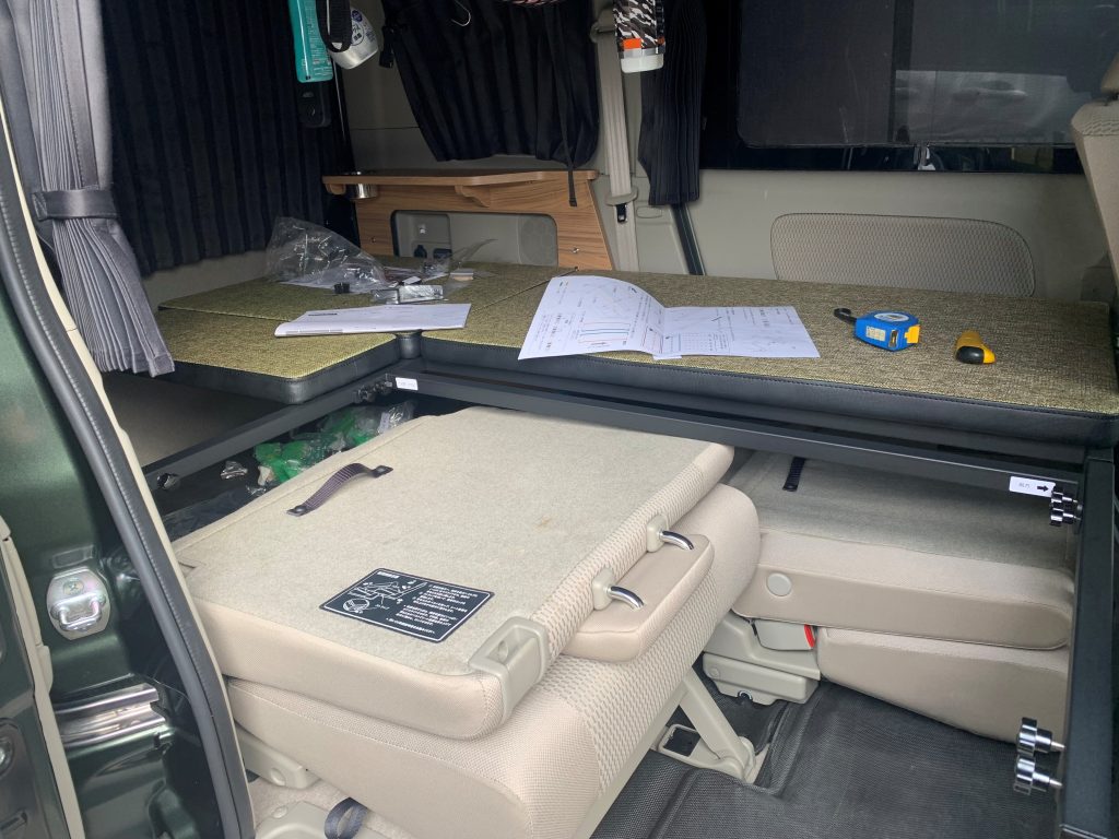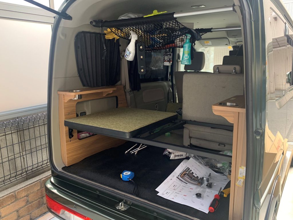 ベッドキット組立中当初は気にならなかったのですが、車中泊でガッツリ平らで水平に寝たいと思いベッドキットを導入しました。導入にあたっては、ベッド下にスノーピーク製シェルフ コンテナ 25が収納出来て極力寝床が低いものと言う条件で探したのが、発売されたばかりのMGRカスタム製でした。